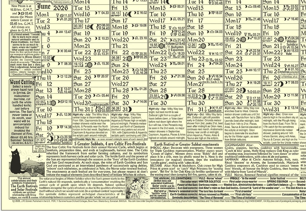 You can see at a glance what phase and Zodiac Sign the Moon is in, also Sun/Zodiac entry times, ('Sun Signs') eclipses, sunrise/set indicator, lots of interesting Pagan details such as an outline guide of the symbolic Sun God and Earth Goddess cycles and their myths, the annual 'Earth Festival' and 'Solar festival' dates (For Witches these are the Greater & Lesser Sabbats) and 'true' Esbat (Full Moon ceremony) dates, (so if the moment of Full Moon occurs when the Moon is below the horizon you know which night to hold Esbat) also an outline guide to the enactment of the seasonal and Sabbat ceremonies and other items.