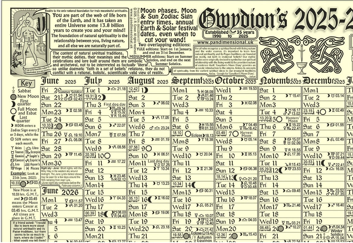 Gwydion’s 2026 Moon Calendar - A3 Poster, Unique Spiritual Calendar, Moon Phase Calendar, Pagan Calendar
