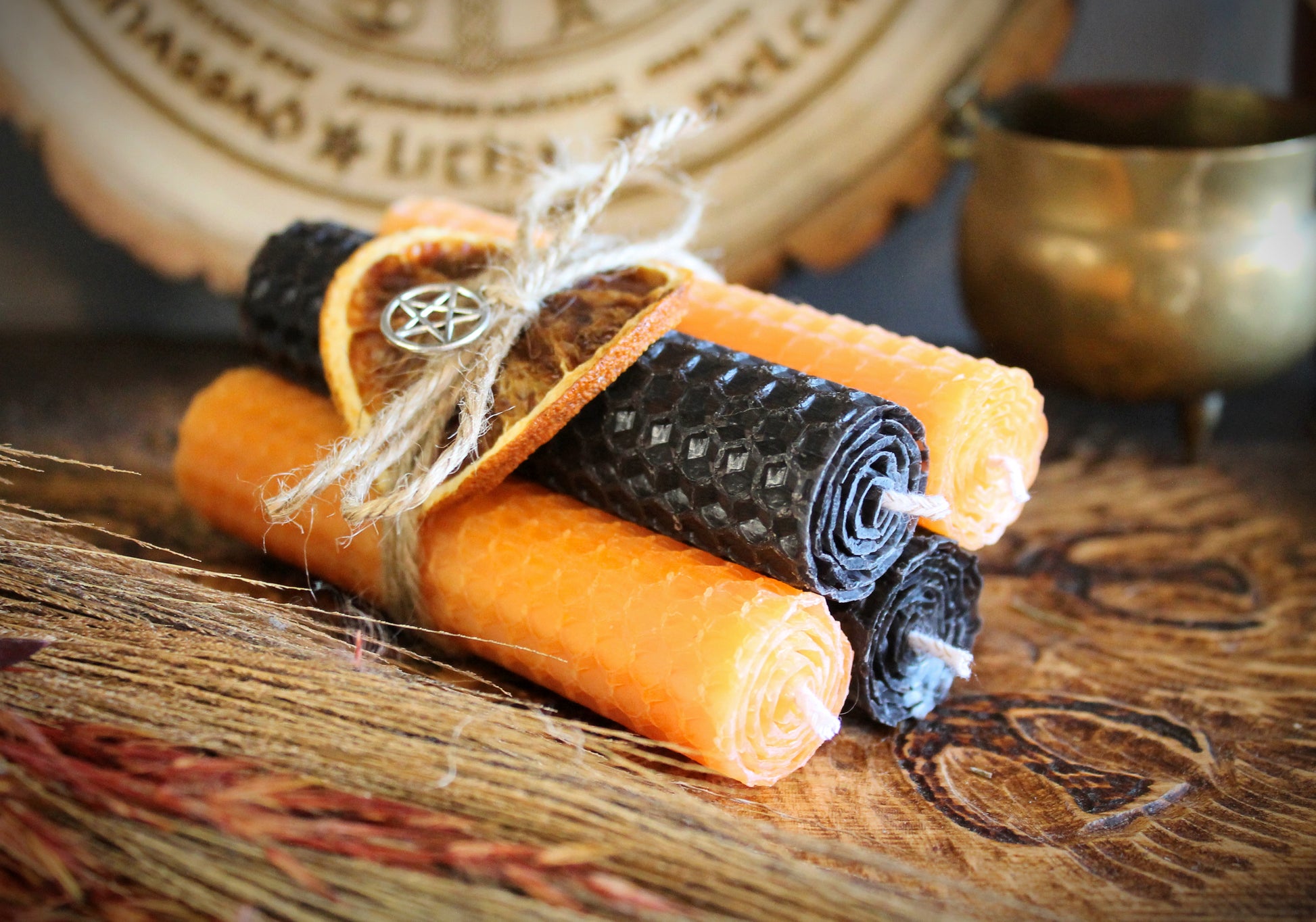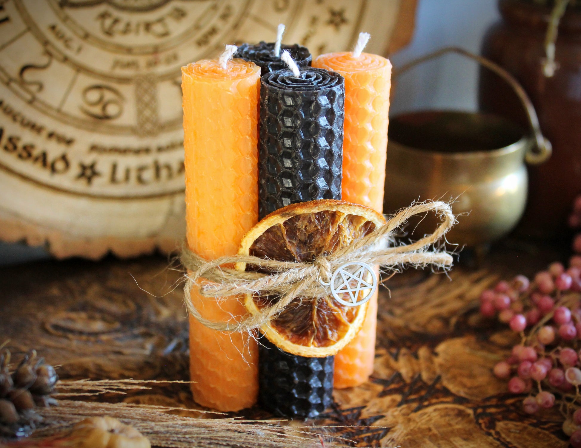 Tied together with natural jute twine, a dried orange slice and a pentacle charm, these candles bring both beauty and intention to your sacred space.